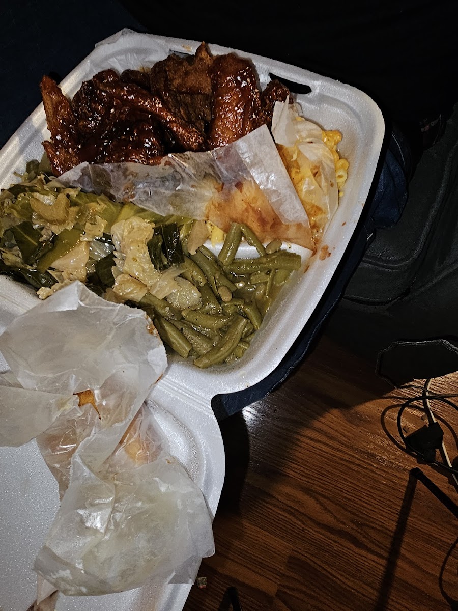 Barbecue Chicken Wings Cabbage String Beans and Macaroni Cheese