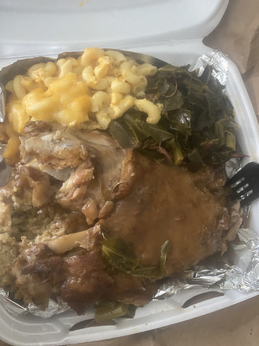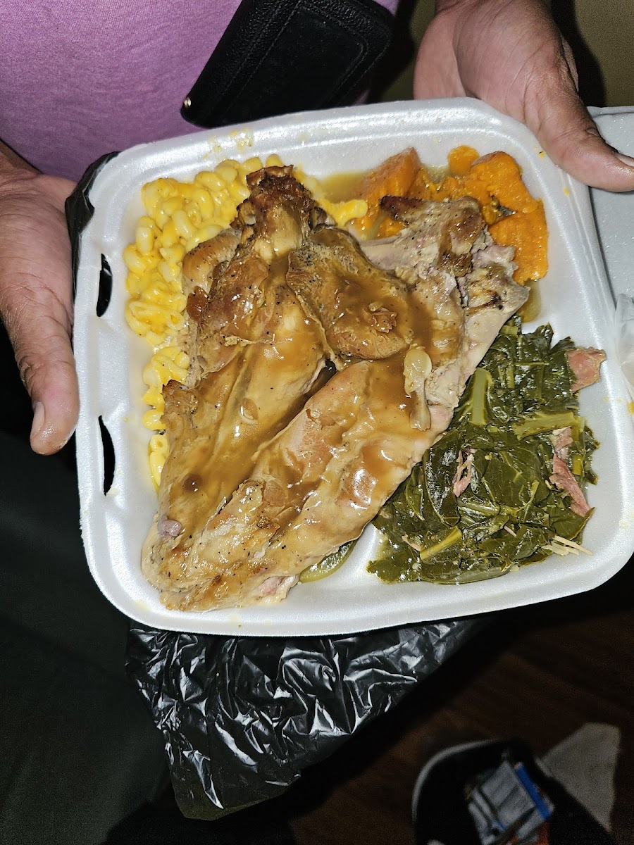 Turkey Wing Dinner with Greens Macaroni Cheese and Sweet Potatoes