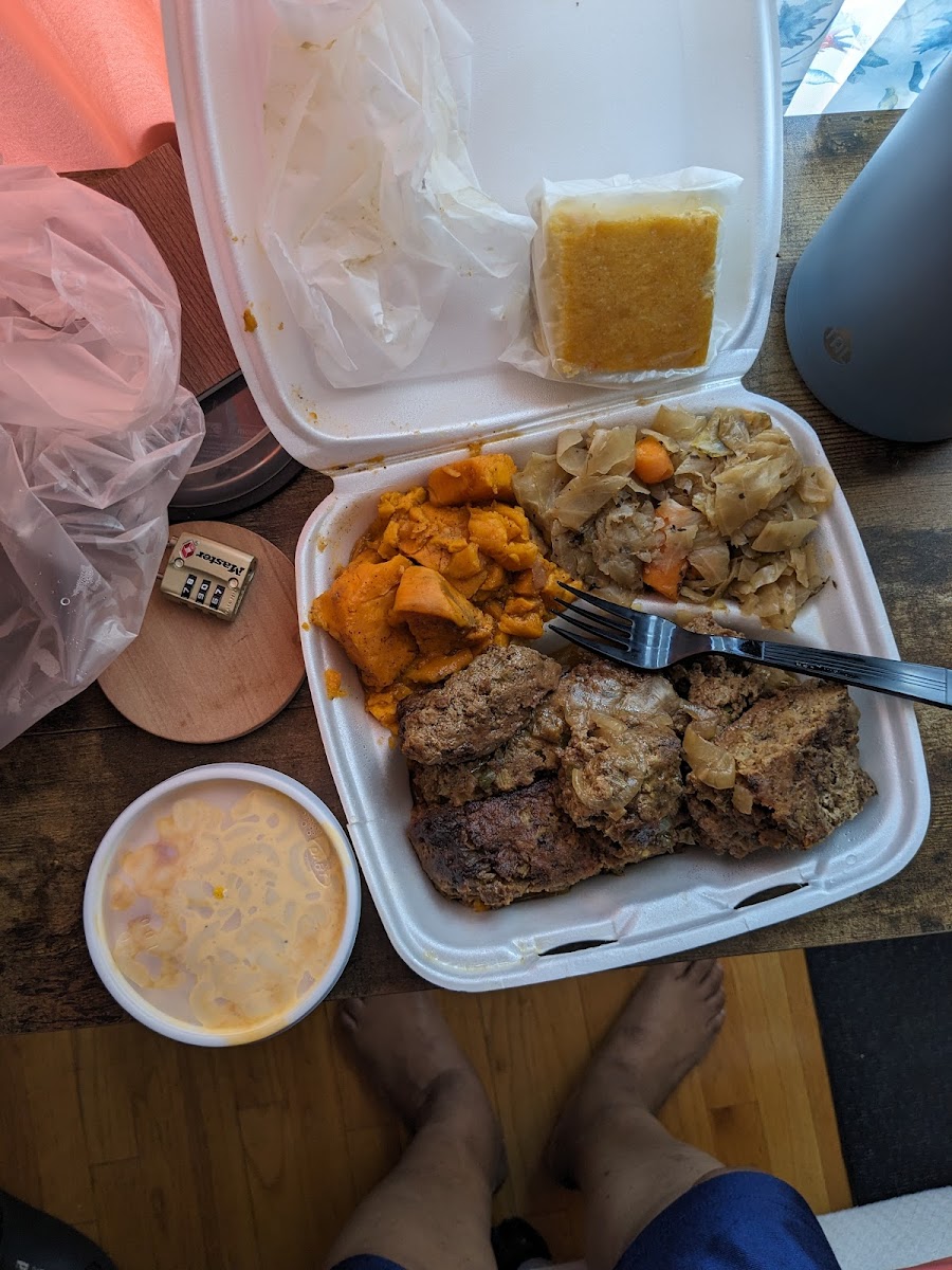 Mac & Cheese Fried Chicken & Sweet Potatoes with Cornbread